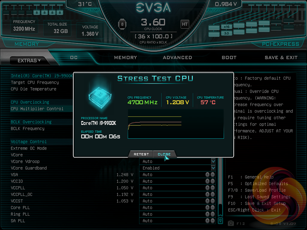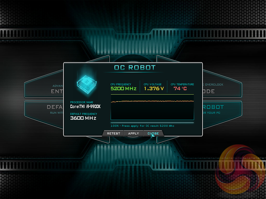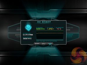 The “EVGA OC Robot” is a tool that will continually overclock the CPU trying to find the maximum stable clock speed and voltage, within acceptable temperatures. In our testing it found 5.2GHz at 1.376v, however, this would not boot into Windows so we're not sure how the in-UEFI tool determines if the overclock is stable or not. It also still wouldn't boot in at 5.1GHz with 1.376v.
