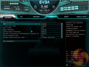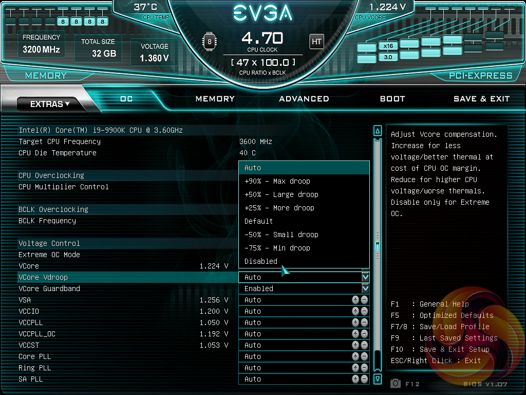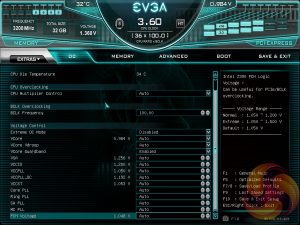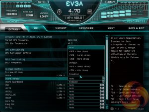 The OC tab is where clock speeds are defined and voltages are set. EVGA offers adaptive or override voltage modes for the VCore as well as an option to control “VCore Vdroop”, effectively what most users understand to be Load Line Calibration (LLC) on other motherboards. However, the granularity of the controls offered and the intuitiveness of using them was less than ideal.
