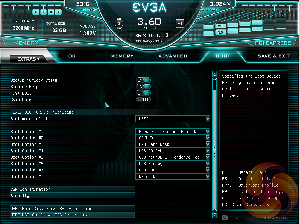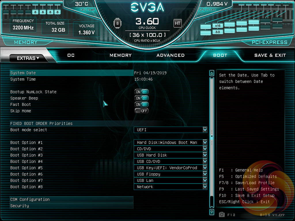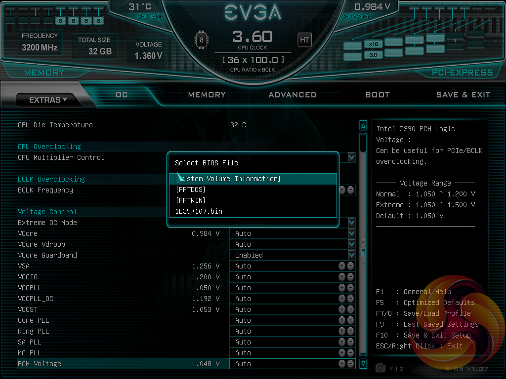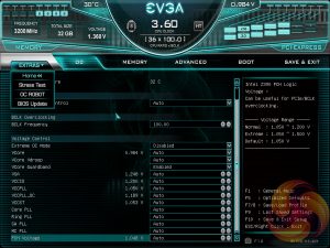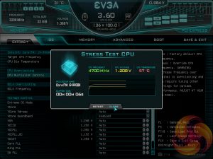 Under the “Extras” menu are three tools – a Stress Test for checking the stability of overclocks, the same OC Robot utility found on the landing page and a light-weight BIOS Update tool. This EVGA motherboard can update one of two ways – by the BIOS flashback USB port without any hardware installed (CPU, memory, etc.) or from a BIOS file on a USB stick accessed within the BIOS Update utility when there is a fully functioning system.