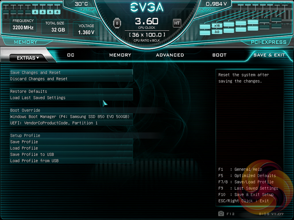 Save & Exit is exactly how it sounds, though it does also have Boot Override options. A summary of changes made to the BIOS settings is presented to the user upon exiting.