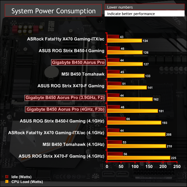 We leave the system to idle on the Windows 10 desktop for 10 minutes before taking a reading. For CPU load results we run AIDA64 CPU, FPU, Cache and Memory stress tests and take a reading after 10 minutes. The power consumption of our entire test system (at the wall) is shown in the chart.
