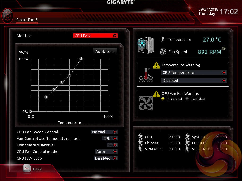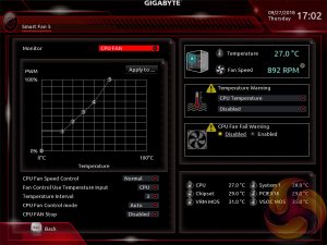 Gigabyte’s Smart Fan 5 utility is a visual GUI that can be brought up through the M.I.T tab. From within here you can set predefined fan speed profiles or create your own, set the temperature hysteresis between fan speed changes and pick a temperature input for the fan curve to follow.