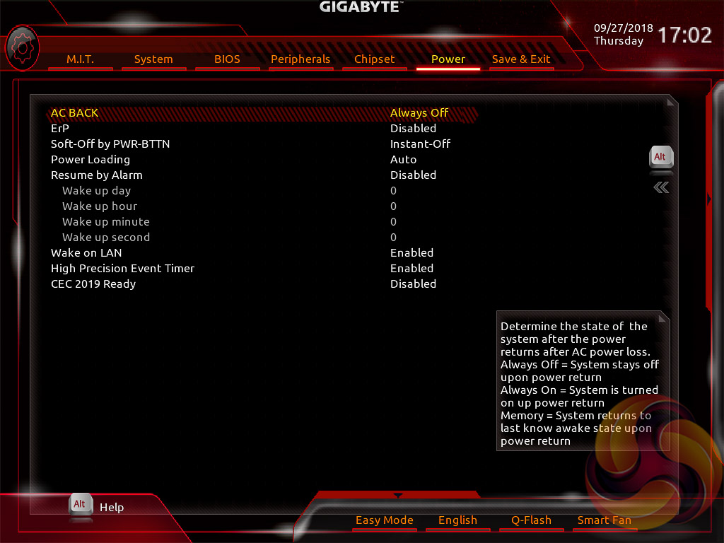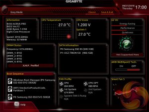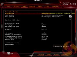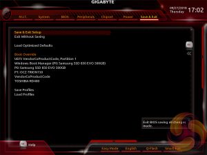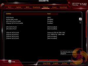 Gigabyte’s UEFI for the Intel-300 and AMD 400-series matches the same style used on its Intel 200-Series and AMD 300-Series products. It represented quite a significant change over previous generations of Gigabyte motherboards (Z170, X99, for example) when it was introduced but has now settled to become the new norm for the company.
