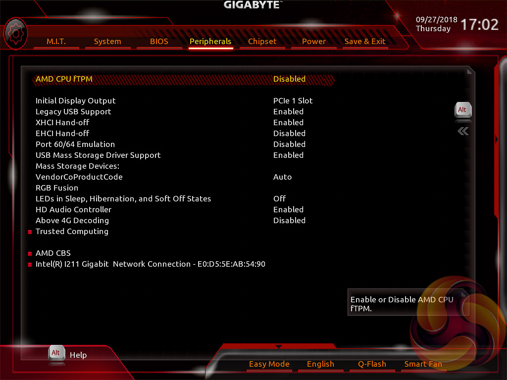 Peripherals and Chipset tabs contain all options pertaining to other hardware on the motherboard that isn’t the CPU or DRAM. USB, NVMe, LAN, Audio, SATA and a number of miscellaneous troubleshooting and compatibility settings are found in these two tabs.