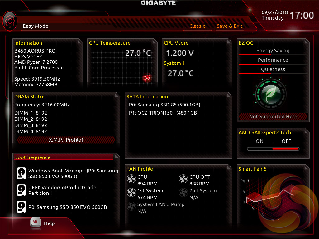 There is a typical Easy Mode page to start which gives frequently accessed options like XMP, Boot Order and various monitoring statistics. Entering into the classic mode (F2) changes the layout to give a wider array of options arranged via a horizontal tabbed structure with nested tabs within each section.