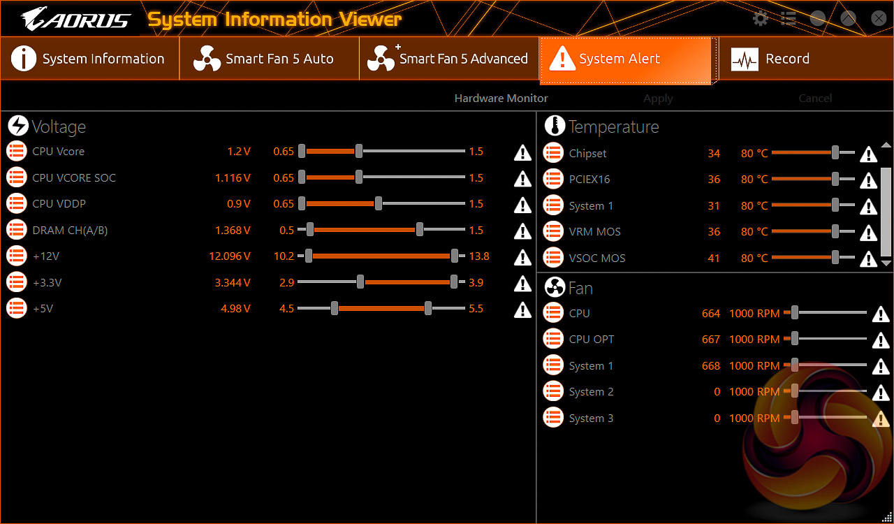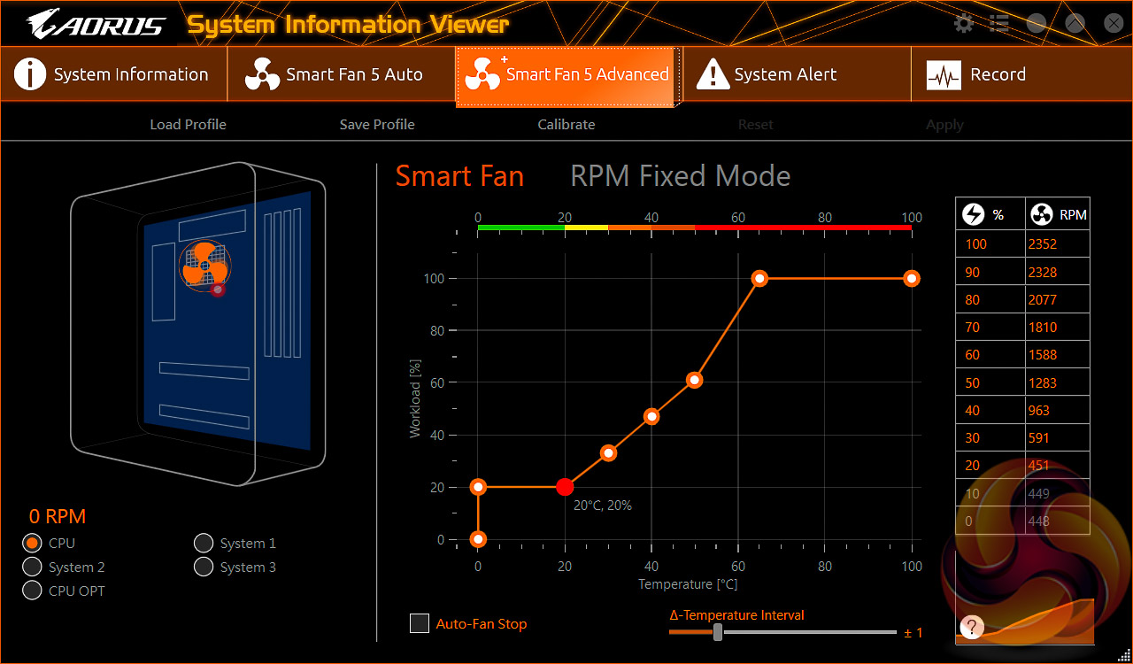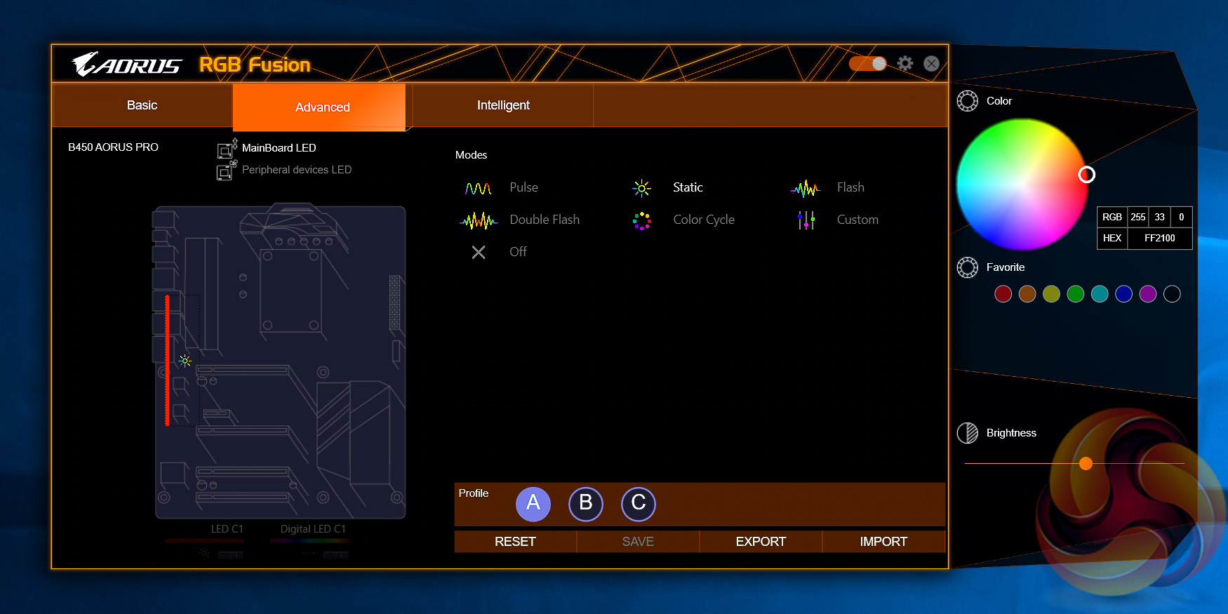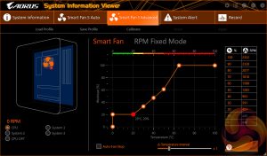 RGB Fusion is Gigabyte’s LED software that will let you manage the onboard RGB LED zones or connected digital or RGB LED strips. There are three tabs – basic, advanced and intelligent – which hold different levels of granularity and control. The advanced tab will allow you to control the motherboard and strips independently of each other while in the basic tab changes of colour and lighting pattern will be automatically applied to all controllable LEDs.