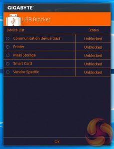 USB blocker allows the USB ports to be blocked at the software level as a security measure, more of “corporate IT” feature than something the average home user might tinker with.