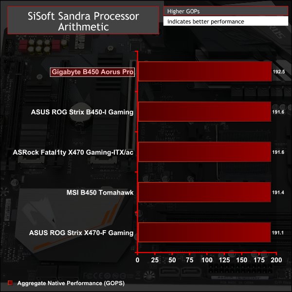 SiSoft Sandra 2018 is a multi-function utility program that supports remote analysis, benchmarking and diagnostic features for PCs, servers, mobile devices and networks. We run the application’s processor arithmetic test to gauge the CPU performance on each tested motherboard.