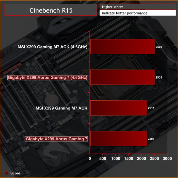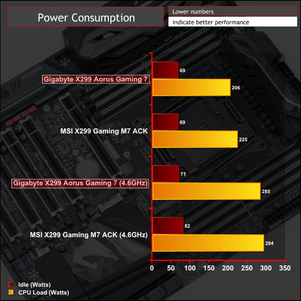 Gigabyte's motherboard was leaner on power consumption than MSI's at stock and overclocked. The default voltage behaviour of the X299 Aorus Gaming 7 when setting a fixed manual voltage is considerably more power efficient than most vendors where a “fixed” or “manual” voltage tends to result in elevated levels of idle power consumption.
