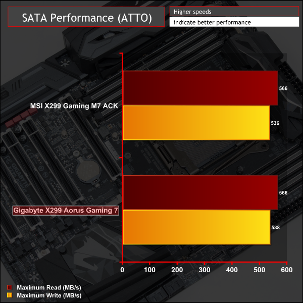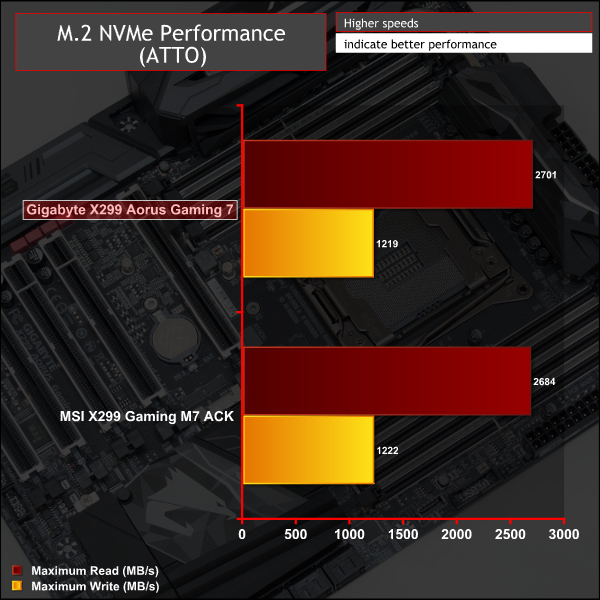 M.2 performance was as expected and cooling was decent enough. After three extended ATTO runs totalling close to 10 minutes temperatures hovered around the low 70s (degrees Celsius). This result was slightly worse than that of MSI's X299 Gaming M7 ACK but there's not a lot in it.