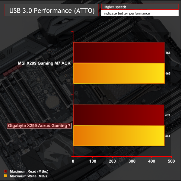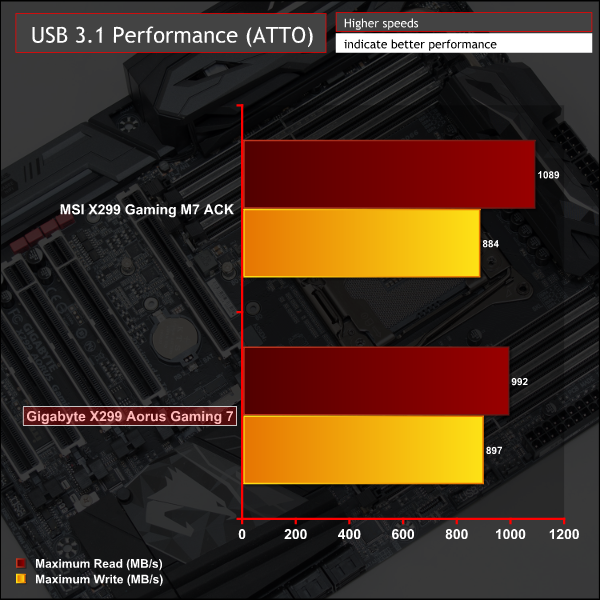 USB 3.0 performance met expectations but USB 3.1 was about 100 MB/s down where we'd expect it to be. Our only theory for this is that the rear USB 3.1 Type-A ports go over a Realtek Hub (RTS5423) rather than direct to an ASMedia ASM3142 controller, this clearly impacts performance. Not only is the peak throughput down but the results were a little bit more inconsistent too.