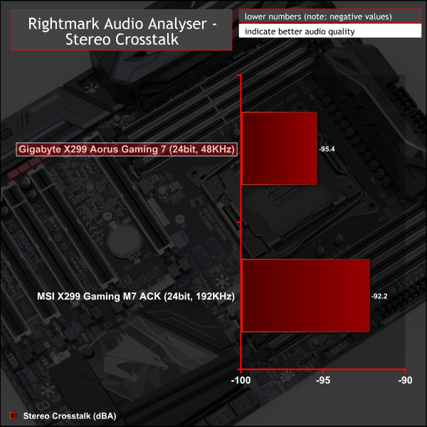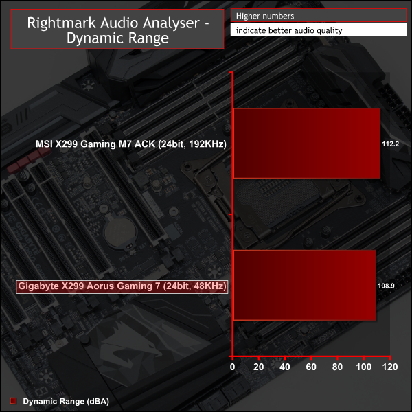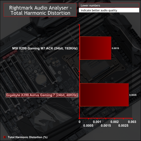 Strangely the Gigabyte X299 Aorus Gaming 7 couldn't operate at 24bit, 192 KHz on the line-in despite having the same audio codec as the MSI motherboard. We had to test at 48KHz instead, meaning the results are not directly comparable.