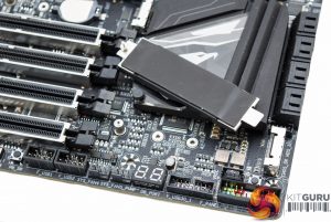 M.2 is available in three different slots, one sits between PCIe slot 1 (X16) and slot 2 (X4), one between the CPU and PCIe slot one, and the other under the chipset heatsink. The M.2 slot under the chipset heatsink is the “cooled” slot with a direct contact thermal pad and heatsink shared with the chipset PCH.