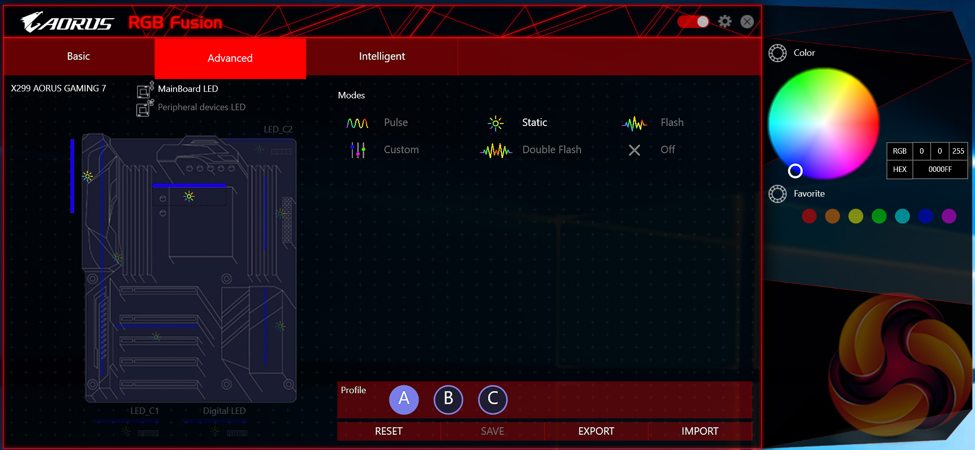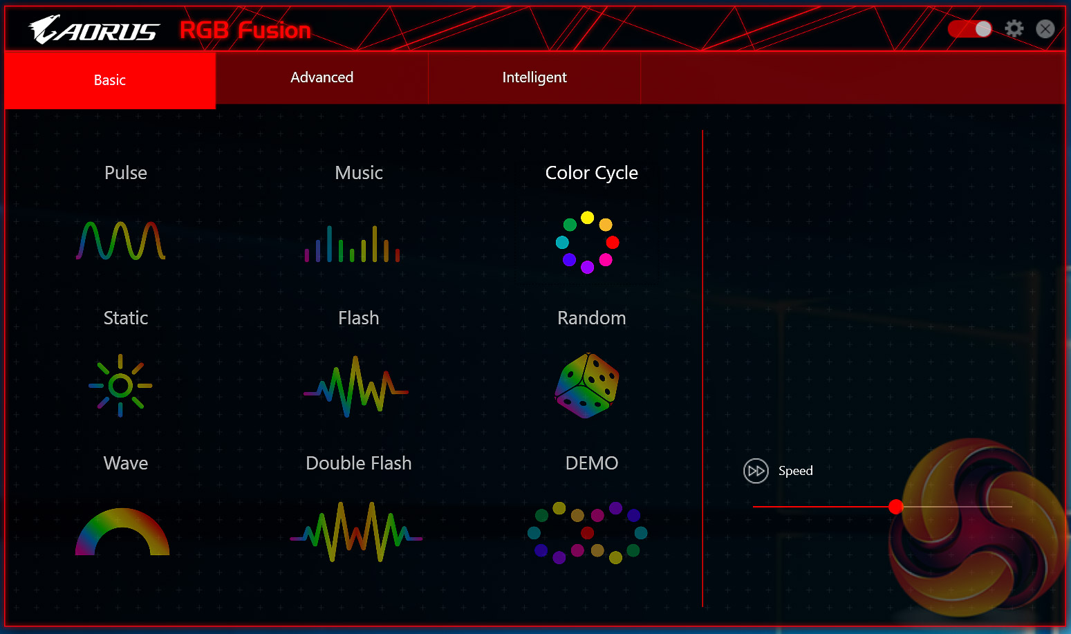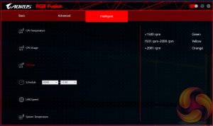 RGB Fusion is Gigabyte’s LED software that will let you individually manipulate each onboard RGB LED zone or connected LED strip. There are three tabs, basic, advanced and intelligent, which hold different levels of detail and options. The advanced tab will allow you to control each zone independently of the other zones while in the basic tab changes of colour and lighting pattern will be automatically applied to all controllable LEDs.