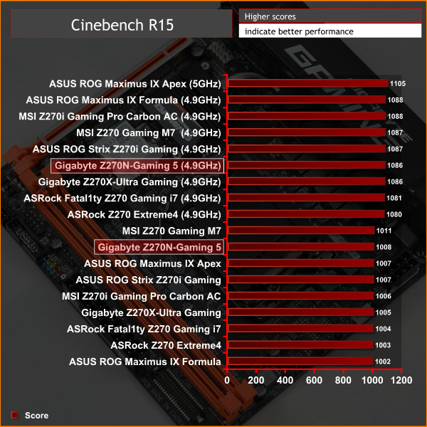 As a performance comparison, we have included the results from eight other Z270 motherboards. The maximum overclocked configuration achieved with any other board was a 4900MHz (49 x 100MHz) or 5000MHz (50 x 100MHz) processor frequency whilst using 3200MHz CL16 memory.