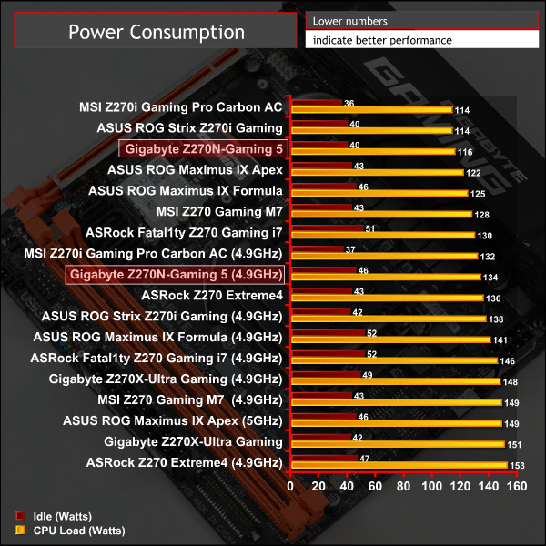 We leave the system to idle on the Windows 10 desktop for 5 minutes before taking a reading. For CPU load results we run AIDA64 CPU, FPU, and Cache stress tests and take a reading. The power consumption of our entire test system (at the wall) is shown in the chart.