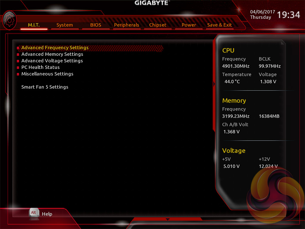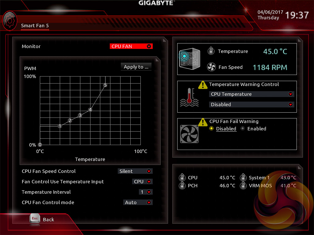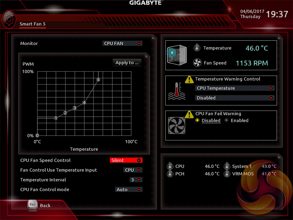 Gigabyte’s Smart Fan 5 utility is a visual GUI that can be brought up through the M.I.T tab. From within here you can set predefined fan speed profiles or create your own, set the temperature hysteresis between fan speed changes and pick a temperature input for the fan curve to follow.