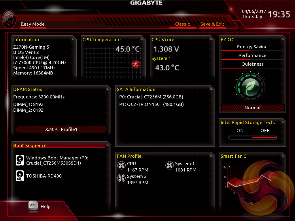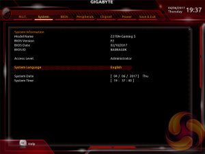 Gigabyte has altered the look and feel of its UEFI environment with the Z270 chipset. Take a look at how the UEFI was on the Gigabyte Z170 Gaming K3 for comparison. The tabbed structure follows the same left to right order but the arrangement of parameters and nested sub-menus has changed a fair bit.