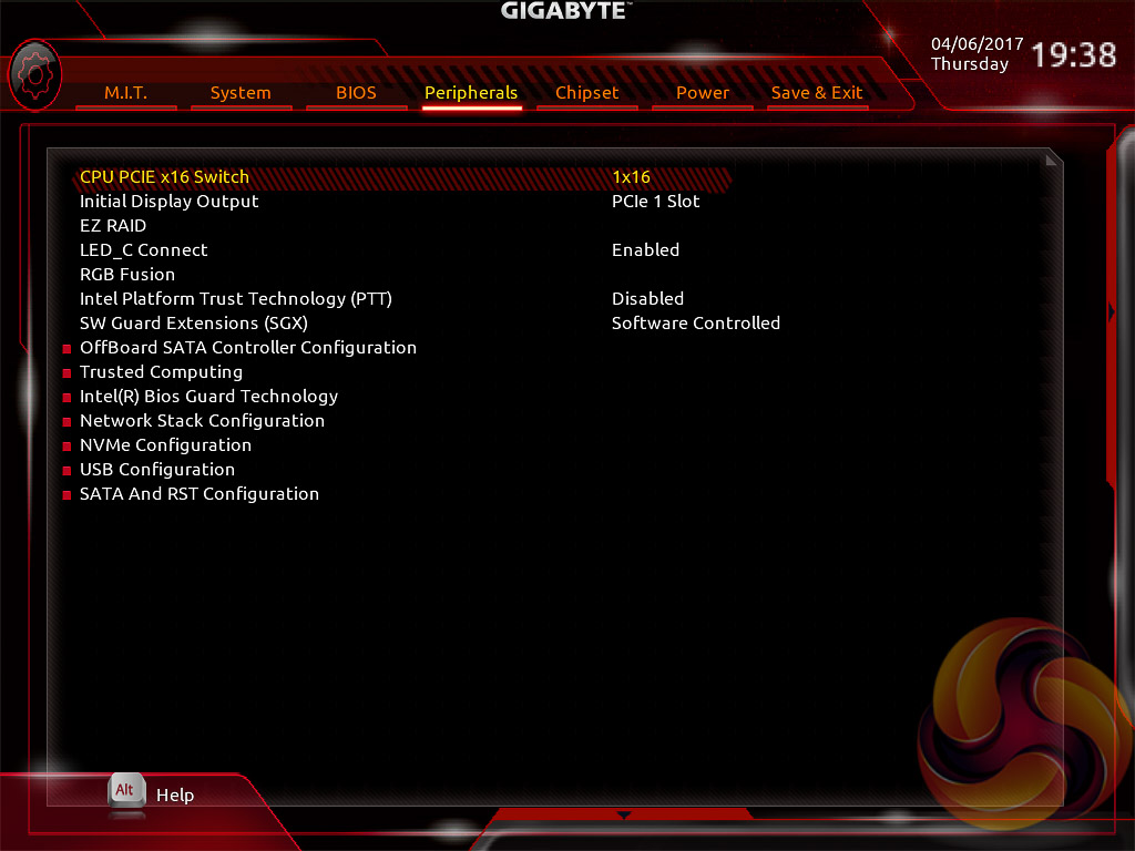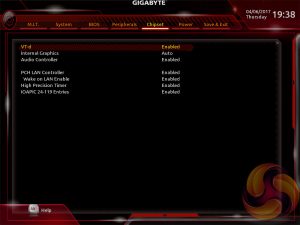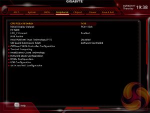 Peripherals and Chipset tabs contain all options pertaining to other hardware on the motherboard that isn’t the CPU or DRAM. USB, NVMe, LAN, Audio, LED, PCIe bandwidth sharing, SATA and a number of miscellaneous troubleshooting and compatibility settings are found in these two tabs.
