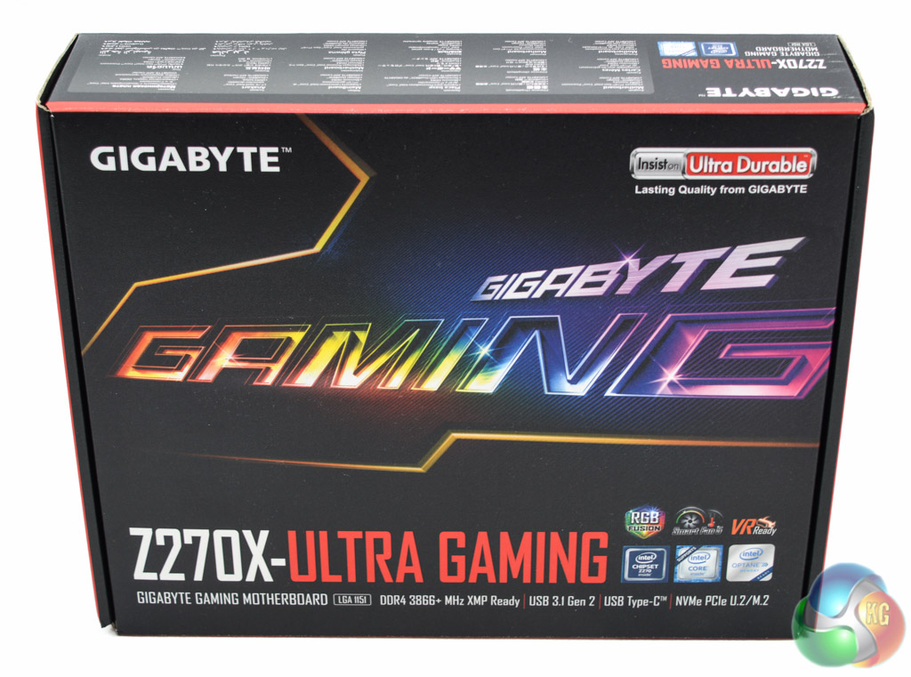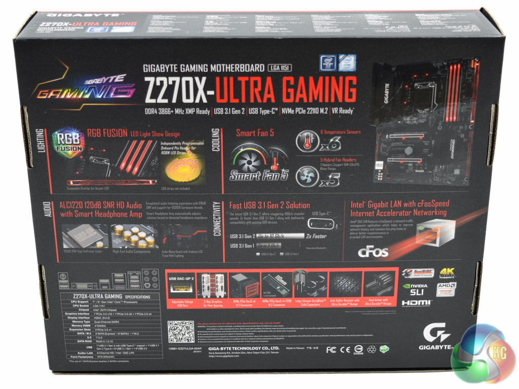 Gigabyte's packaging is simple and to the point with the Z270X-Ultra Gaming. The back of the box highlights four key focus areas for this Gigabyte motherboard which are audio, cooling, connectivity and lighting.