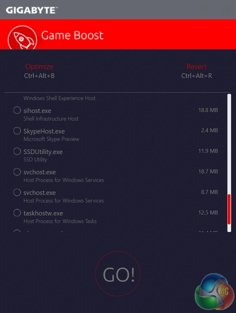 Gigabyte Game Boost is a basic attempt at a “performance enhancing” software application. In reality it does little more than free up RAM and CPU cycles used by terminating non-essential processes that are running in the background. Unless you're really short on system memory it's hard to imagine this making much of a difference, Gigabyte has a revert command whereby all terminated processes will be restarted if Game Boost caused problems.