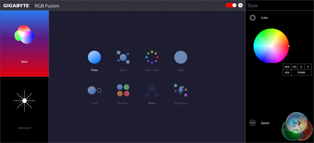 RGB Fusion is Gigabyte's LED controlling software that will let you individually manipulate each onboard RGB LED or connected LED strip. There are two tabs, basic and advanced, which hold different levels of detail and options. The advanced tab will allow you to control each zone independently of the other zones while in the basic tab changes of colour and lighting pattern will be automatically applied to all controllable LEDs.