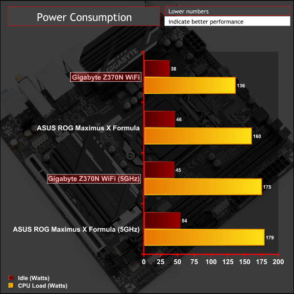 At stock speeds the Gigabyte motherboard applies 1.175v of vCore and along with the compact size of the motherboard that explains the modest power consumption. At overclocked speeds power consumption rises a little but is still more favourable than full-ATX counterparts.