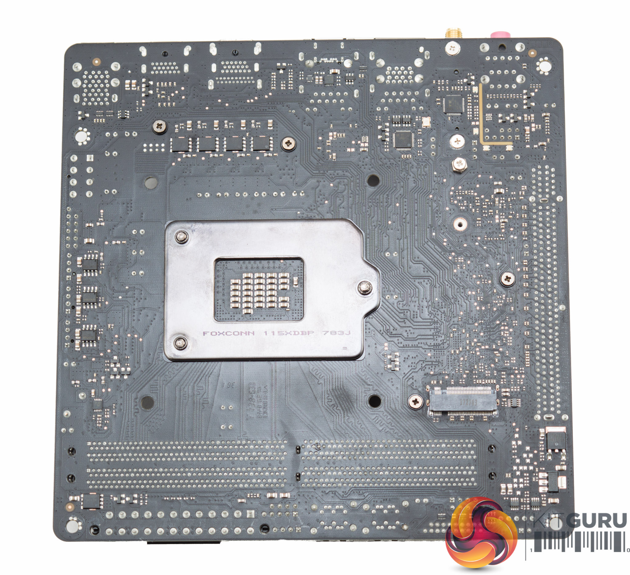 Underneath the motherboard is a second M.2 slot, also supporting up to 80mm drives, along with a number of cross-head screws that secure the CPU VRM heatsink, chipset heatsink and WiFi module. Four of the low-side vCore MOSFETs sit on the underside along with the Intel I219V controller, ITE 8295FN LED controller chip and three nuvoTon 3947S ICs that provide controls to the three fan ports.