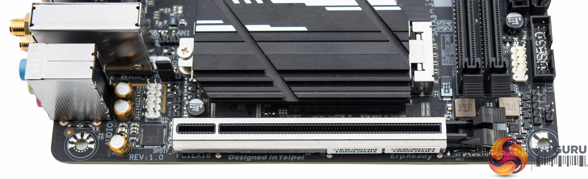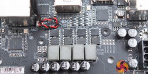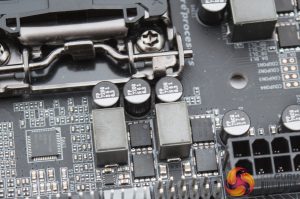 The PCIe lane is shielded which should enhance long term durability. Next to the PCIe lane is the Realtek ALC1220 audio codec paired to a selection of Nippon Chemi-Con audio capacitors.