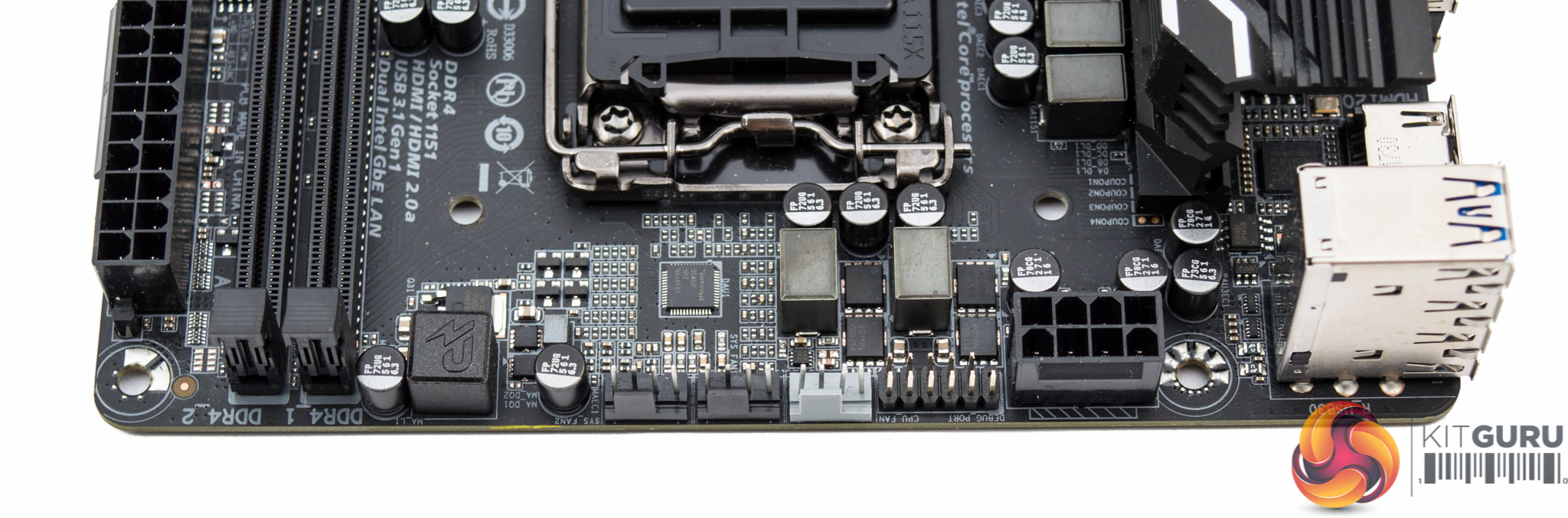 The CPU has a 4+2 phase design using an Intersil ISL95866 hybrid-digital PWM controller, ON Semiconductor MOSFETs and six inductors. The four CPU vCore phases have eight NTMFS4C06N low-side and four NTMFS4C10N high-side MOSFETs while the two iGPU phases use two NTMFS4C06N low-side and two NTMFS4C10N high-side MOSFETs.