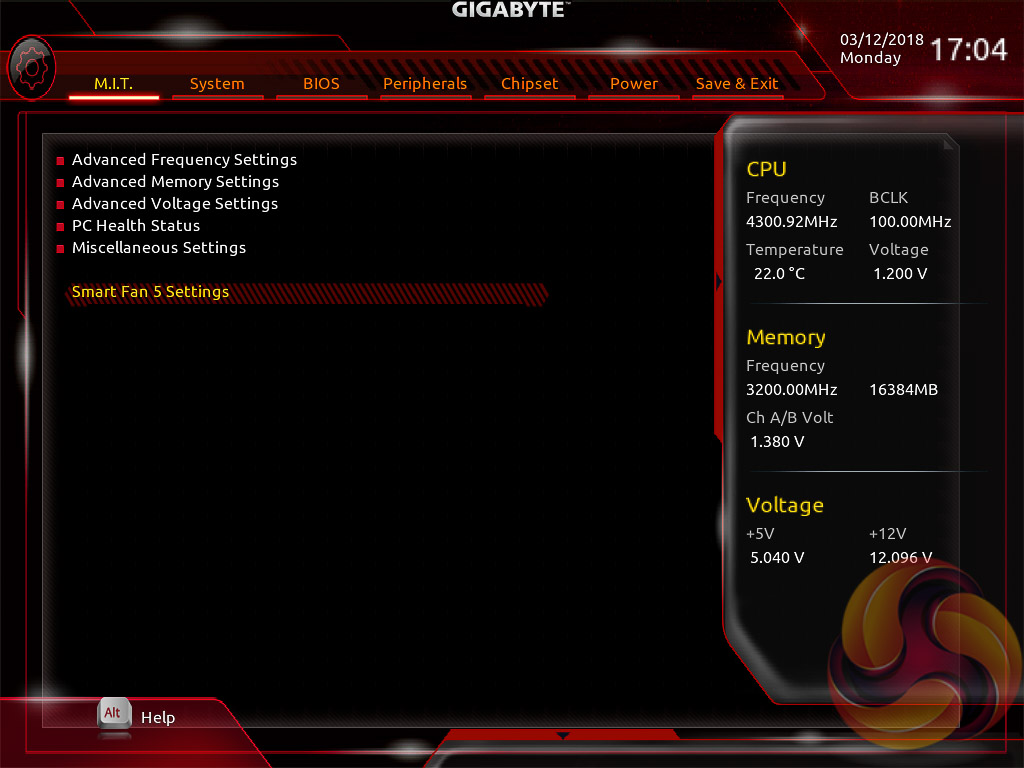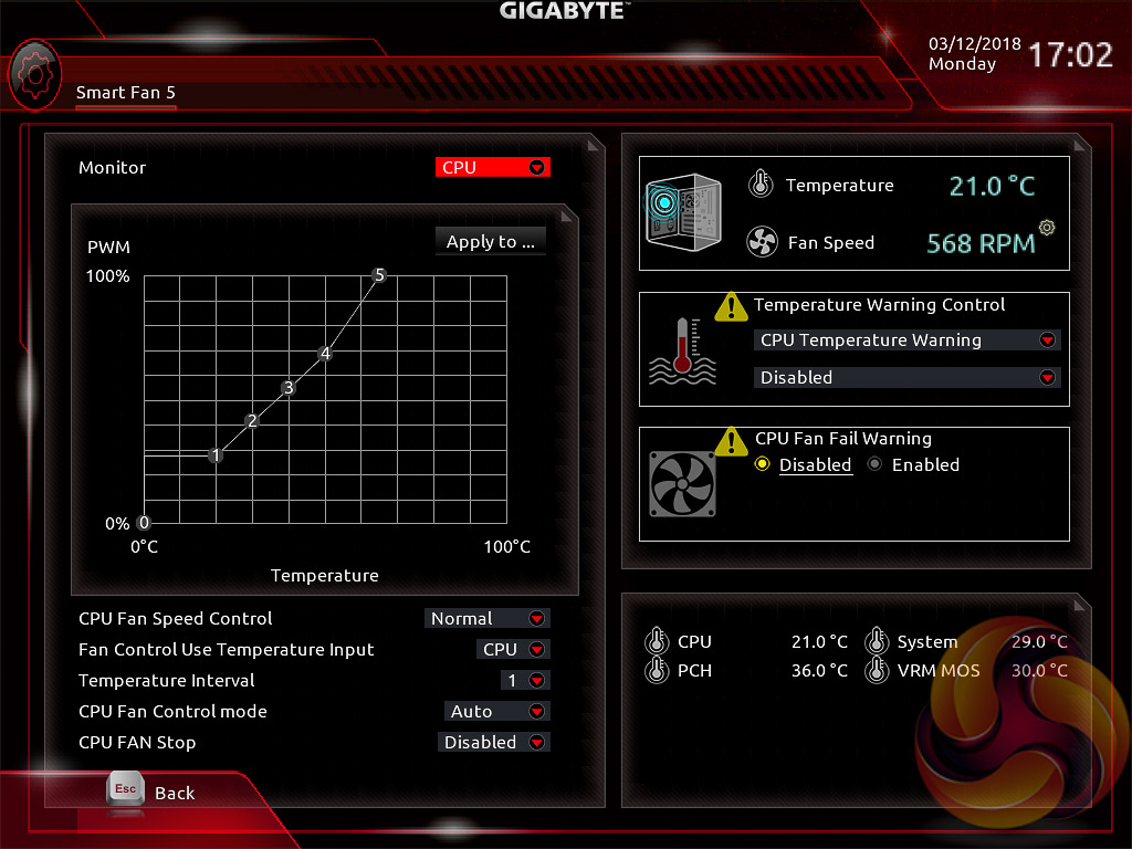 Gigabyte’s Smart Fan 5 utility is a visual GUI that can be brought up through the M.I.T tab. From within here you can set predefined fan speed profiles or create your own, set the temperature hysteresis between fan speed changes and pick a temperature input for the fan curve to follow.