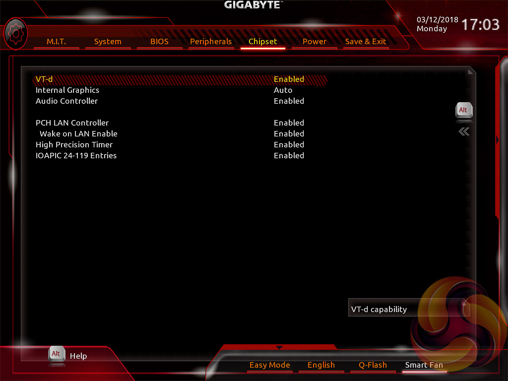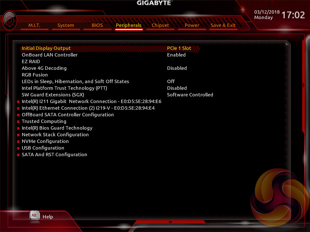 Peripherals and Chipset tabs contain all options pertaining to other hardware on the motherboard that isn’t the CPU or DRAM. USB, NVMe, LAN, Audio, SATA and a number of miscellaneous troubleshooting and compatibility settings are found in these two tabs.