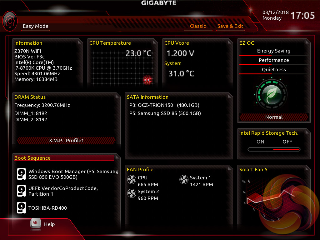Gigabyte’s UEFI with the Z370 series matches the same style used on its Z270 and X299 products. It represented quite a significant change over previous generations of Gigabyte motherboards (Z170, X99) when it was introduced but has now settled to become the new norm for the company.