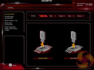 The Gigabyte Q-Flash BIOS update utility sits in its own UEFI environment, separate from the main UEFI, and is a rather tidy implementation. One of the novel aspects of it is an ability to choose between two different UEFI flash modes – one which updates the Intel ME and one which doesn’t (Intact and Fast, respectively).