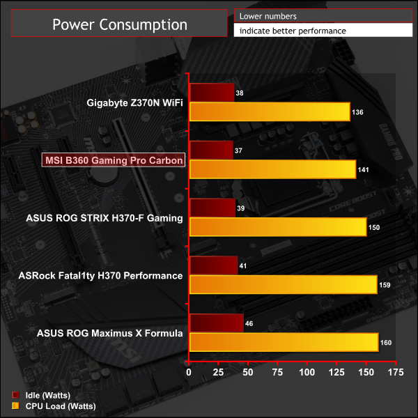 Power consumption was markedly lower than H370 equivalents, in part this is likely down to a conservative vCore that varied between 1.21-1.24 under load. It is worth noting that since the vCore voltage cannot be adjusted, you'd never be able to reduce power consumption further by under-volting.
