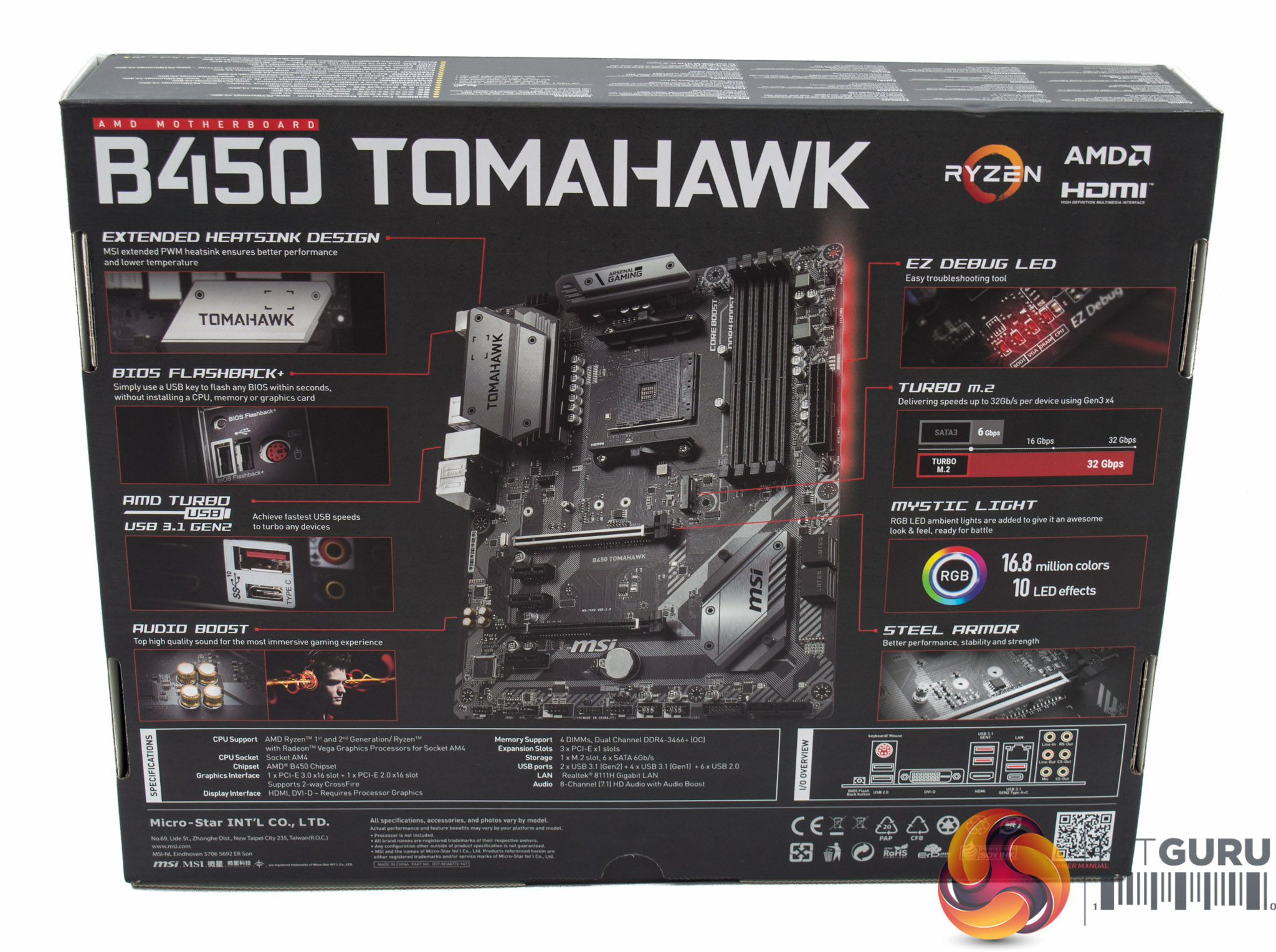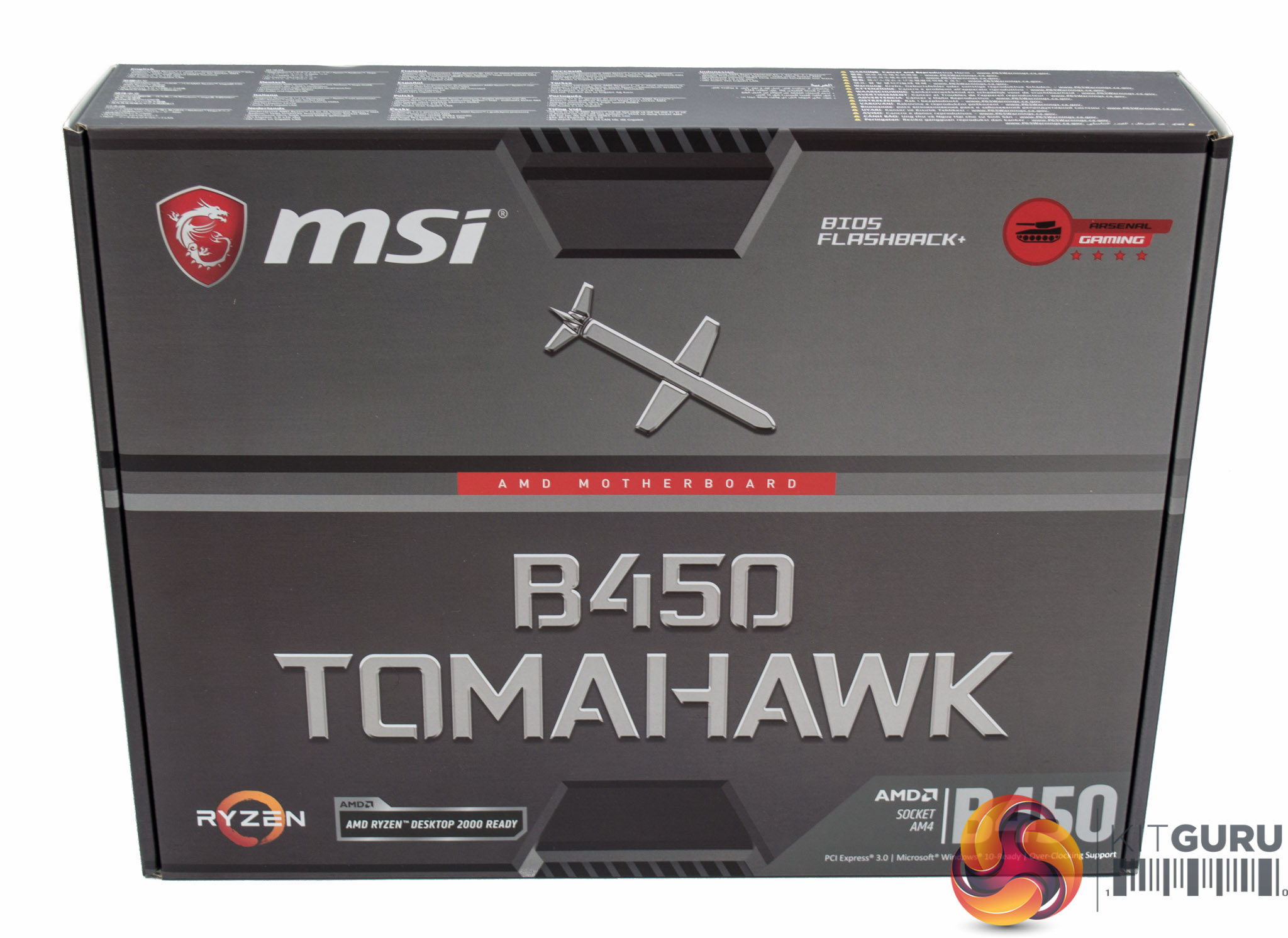 MSI's packaging and presentation for the B450 Tomahawk follows its military theme. MSI segments this product as “Arsenal Gaming” (4 star) which sits below its Performance Gaming (5 star) and Enthusiast Gaming (7 star) segments. That gives a rough indication that MSI positions this product as an entry-level gaming motherboard for the AM4 socket.