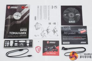 The accessory bundle is mostly documentation along with a driver/utility DVD, two SATA cables, a rear I/O shroud, case badge sticker and M.2 mounting screw.