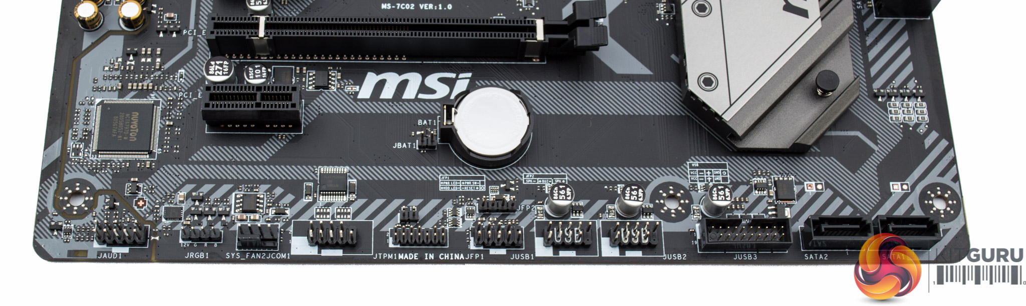 MSI touts RGB LED support but there's only one integrated lighting zone which is a single LED strip, formed of eight individual LEDs, running under the 24 pin connector. Two optional RGB headers at the top and bottom of the motherboard, in the pin layout 12v G R B, are available to attach additional LED strips to. Each RGB header uses a Texas Instruments TPS25944L IC to provide its 12-volt power and control.