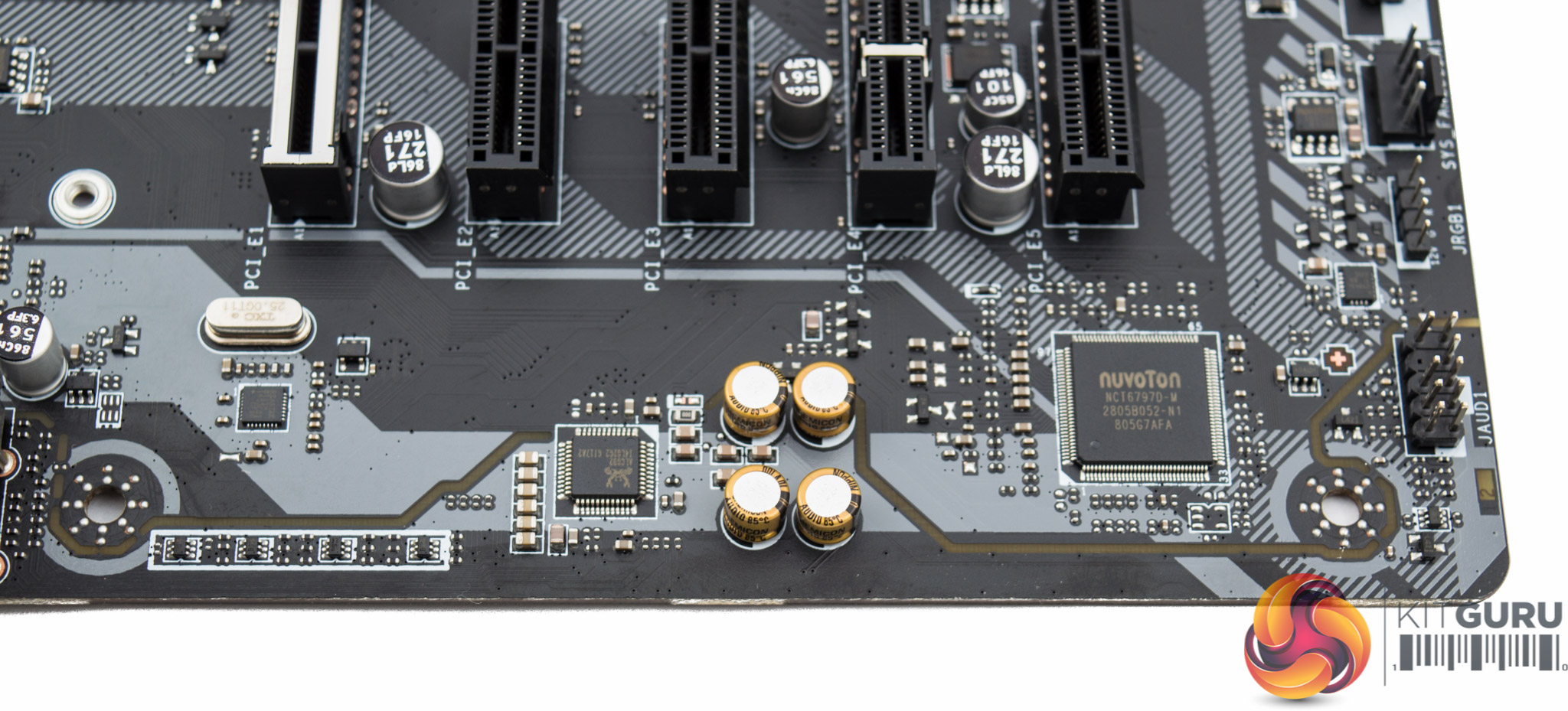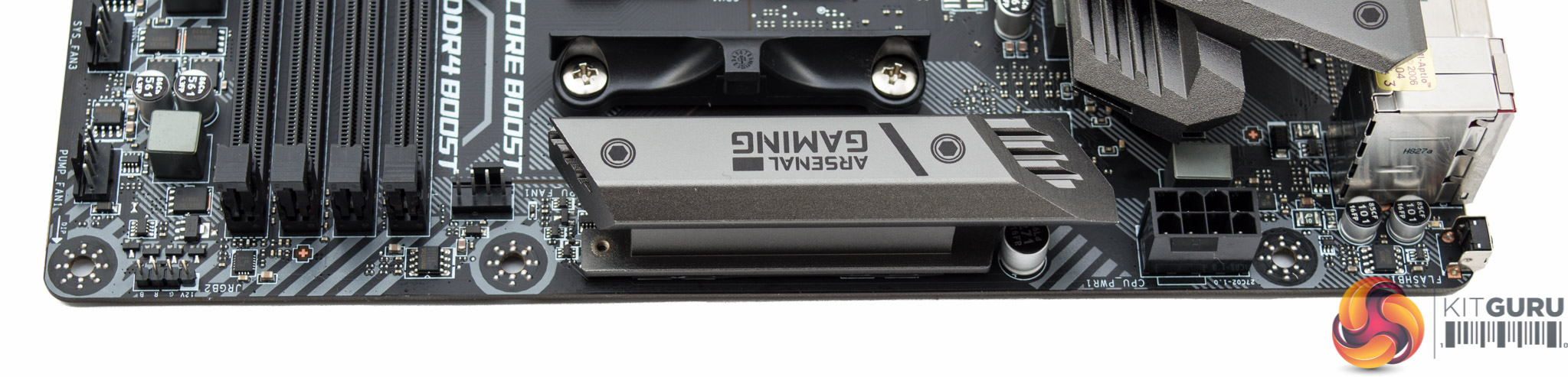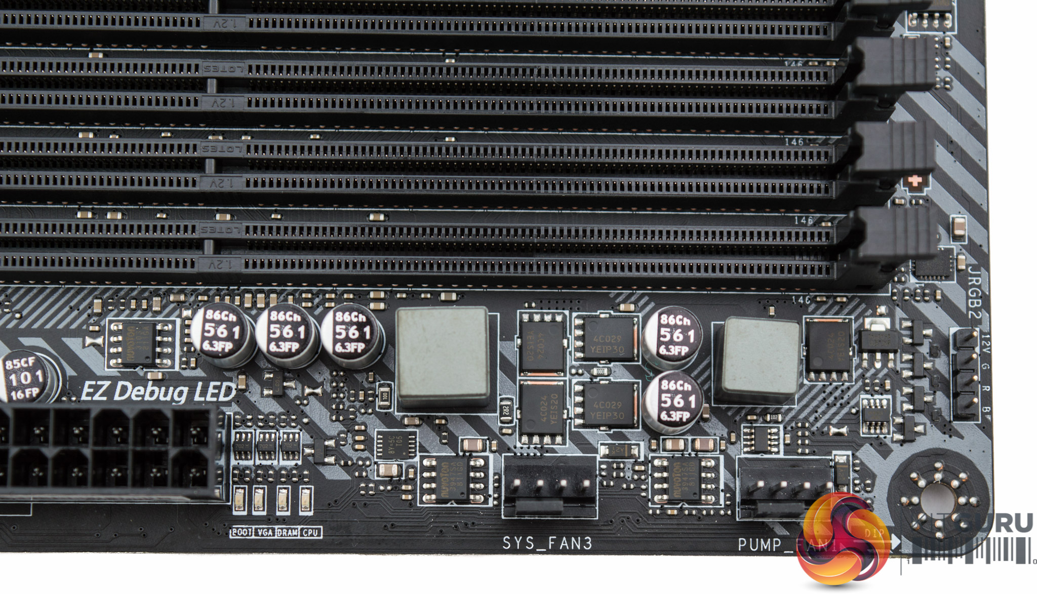 The CPU socket draws power through a single 8-pin EPS connection and near to the CPU socket are three fan headers (CPU, PUMP, SYS). All fan headers on the motherboard have a Nuvoton 3947SA controller IC.