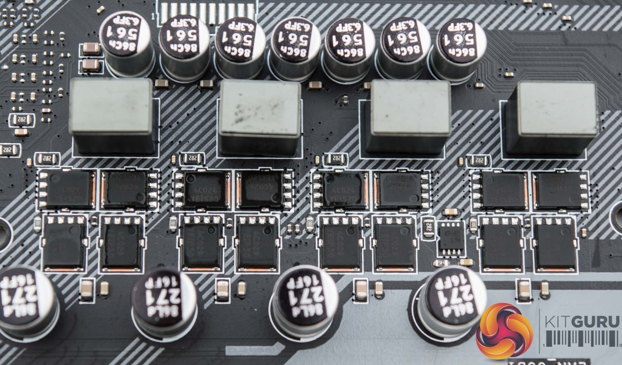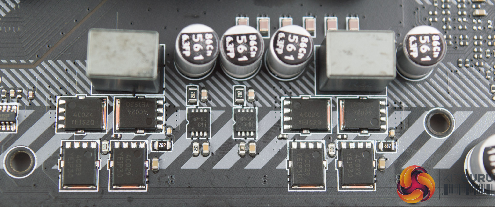 Each phase on the CPU and SOC VRMs uses two high-side and two low-side MOSFETs. The high-side MOSFETs are ON Semiconductor 4C029N and the low-side are ON Semiconductor 4C024N.