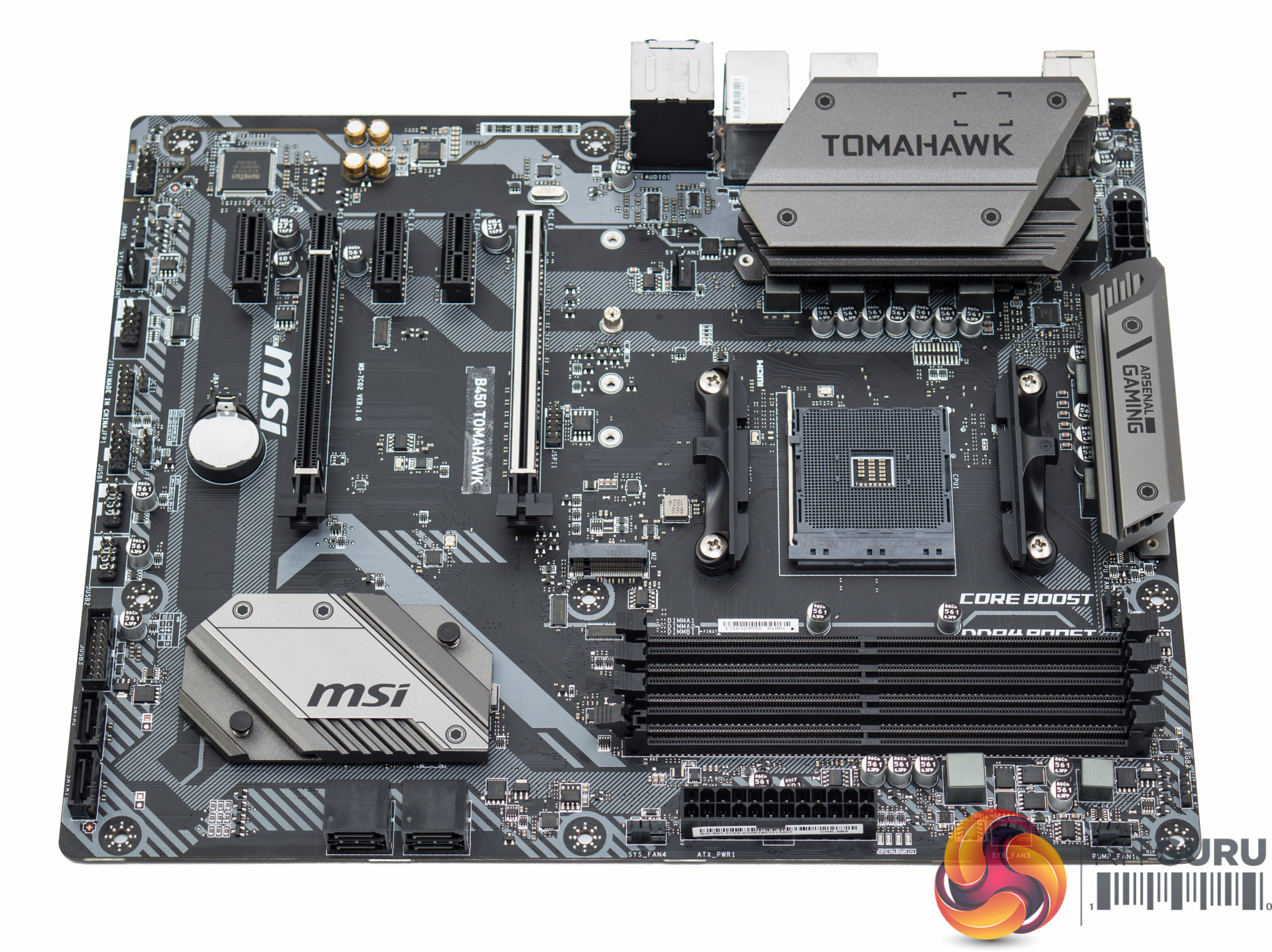 The appearance of the MSI B450 Tomahawk is typically subdued with a black and grey colour scheme that uses industrial-stroke-military patterns for the heatsinks and PCB. It's a fairly neutral design overall that should appeal to most audiences and it is pleasing to see MSI ditching the chunky plastic shrouds in favour of a larger VRM heatsink with less restriction on airflow.
