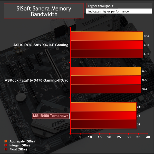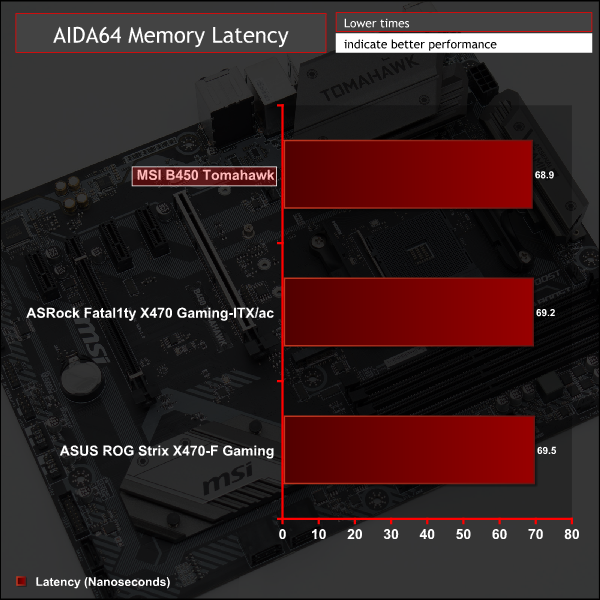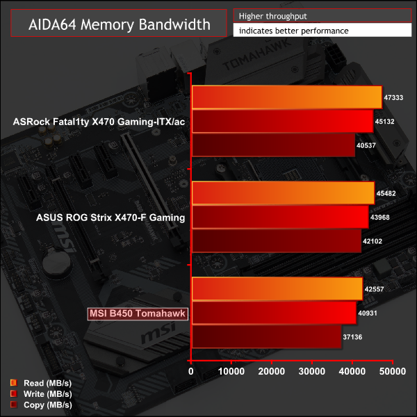 Memory performance was down on MSI's B450 Tomahawk but this seems to be related to the instability issues we experienced. As we noted in the UEFI section of this review MSI's B450 Tomahawk was not stable using the XMP profile, we had to increase the voltage to 1.4v to get stability (instead of 1.35). However, it seems that performance is also affected, as well as stability.