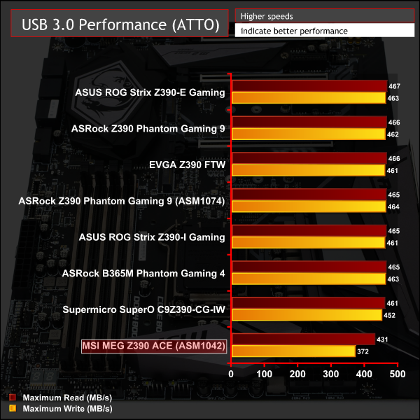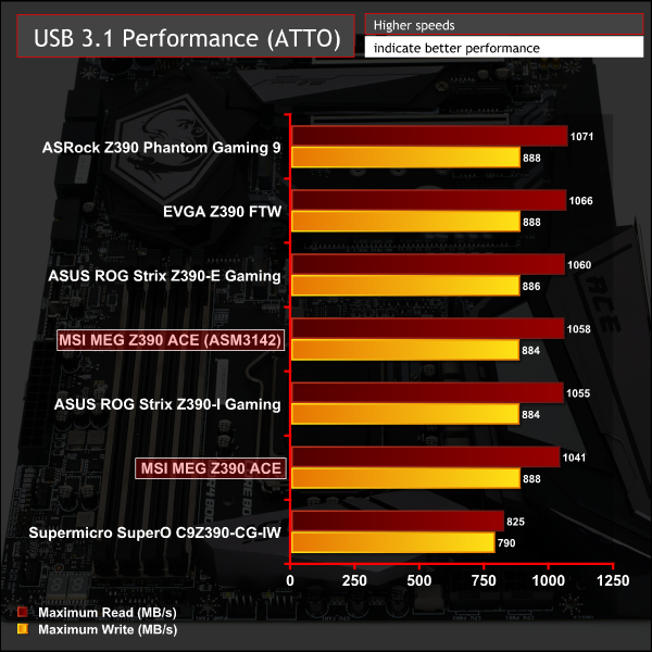 MSI deploys a low-performing USB 3.0 controller, but more than makes up for this with two different USB 3.1 controllers, the Z390 chipset and ASMedia ASM3142, that produce eight USB 3.1 ports in total.