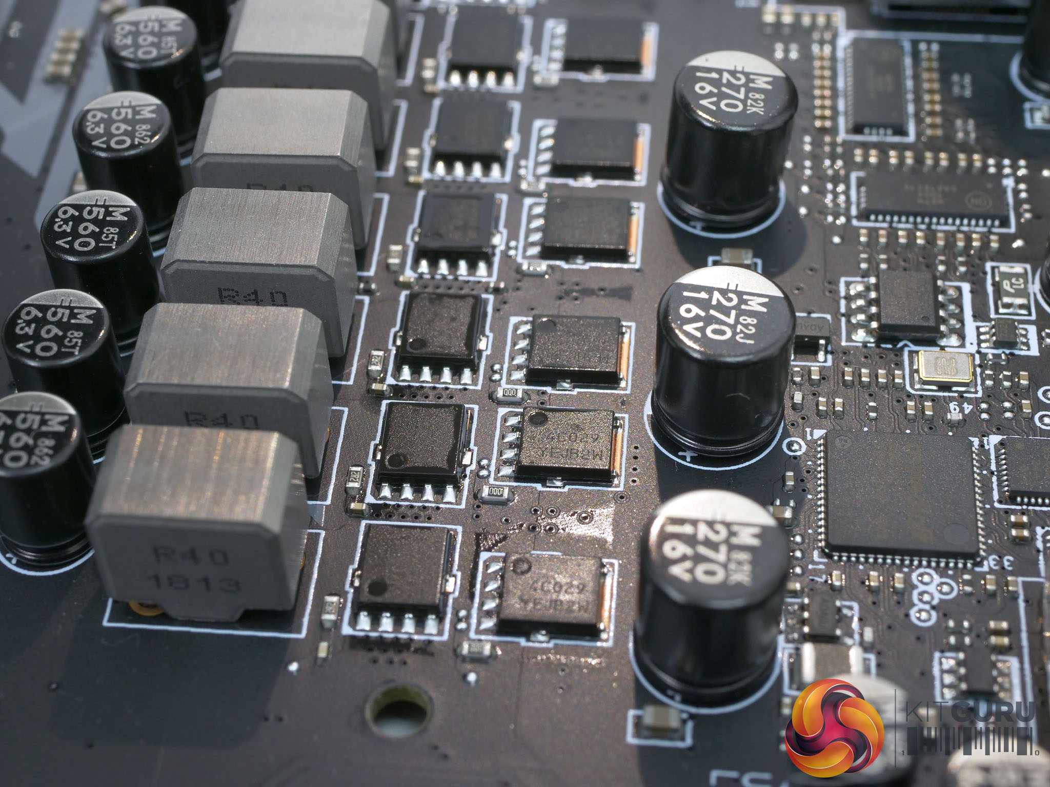 There are six IR3598 phase doublers found on the underside of the motherboard which support the doubling of 6 PWM signals to 12 PWM phases.
