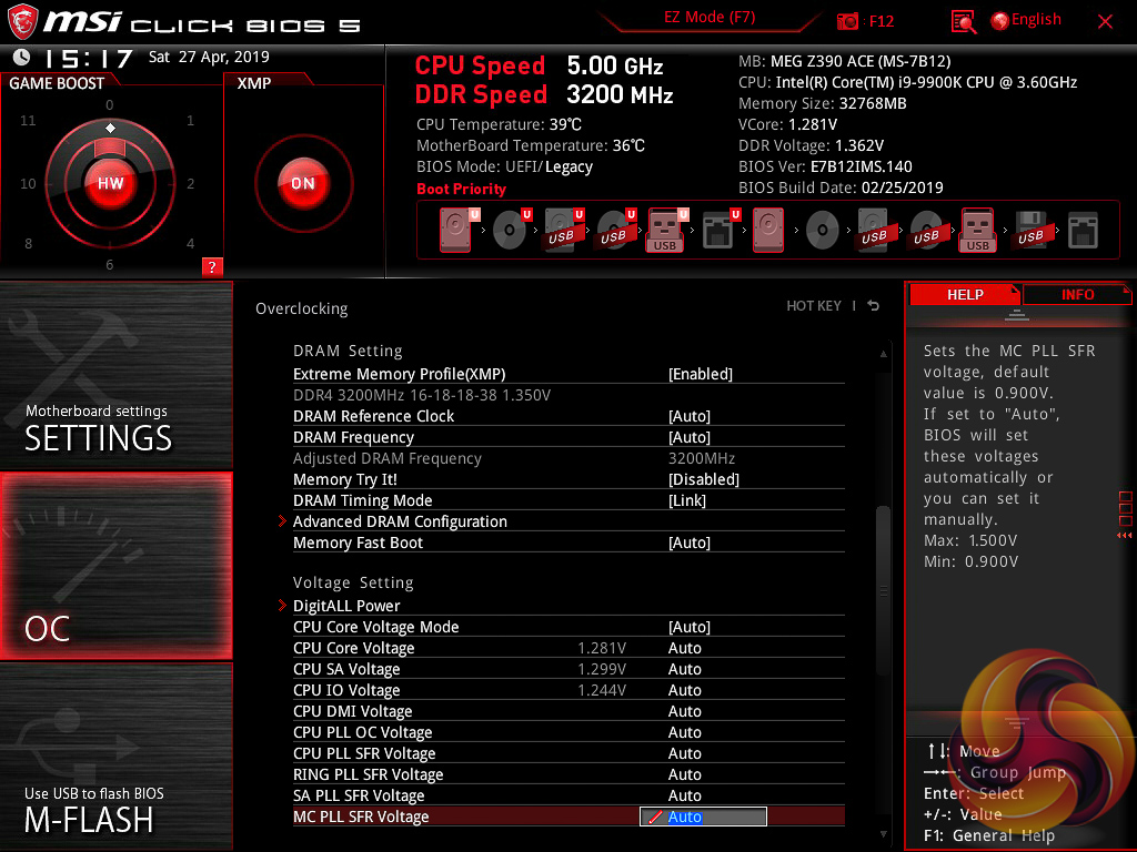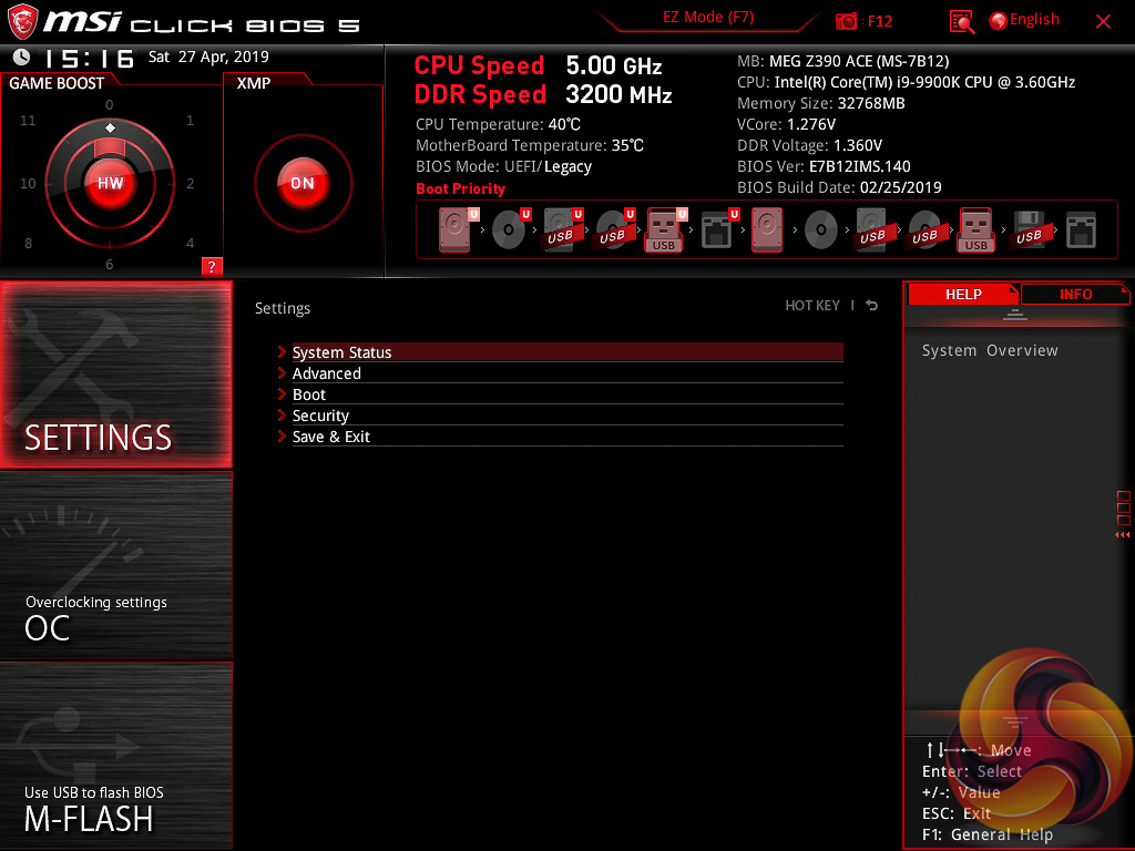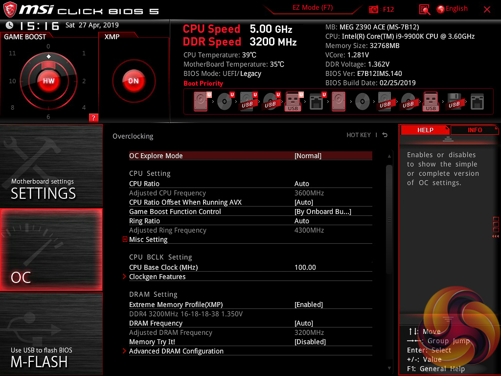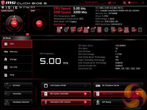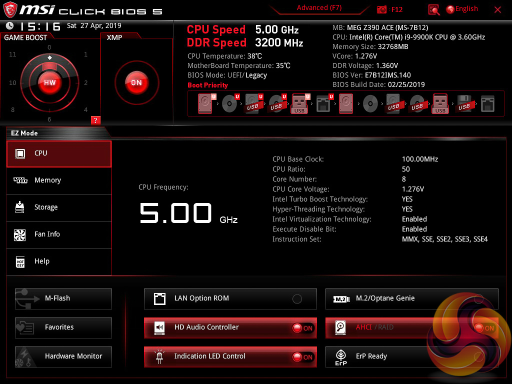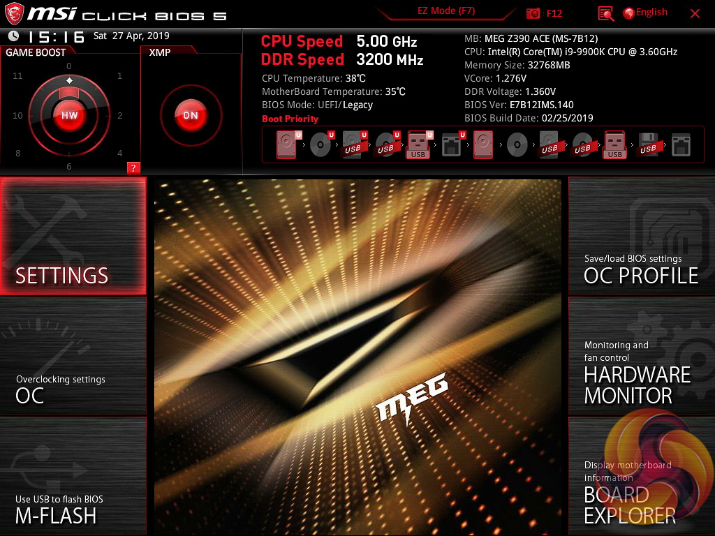 MSI’s UEFI has remained relatively consistent across its range of high-end motherboards for Intel platforms for the last few years. The MSI MEG Z390 ACE sports version 5 of MSI’s Click BIOS which launches into an EZ Mode splash screen with an option to head into the advanced mode with the press of F7.