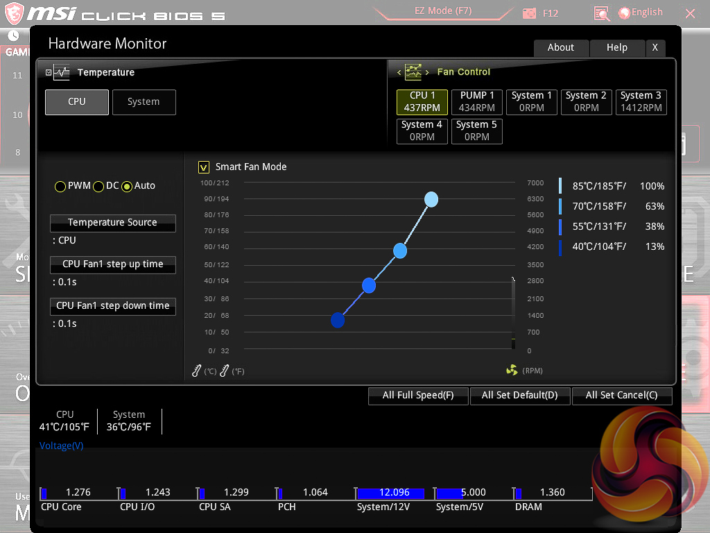 The fan controls are adequate for this motherboard allowing you to change the temperature source for each temperature-guided fan profile and the “step-up” time between each of the adjustment thresholds (hysteresis).