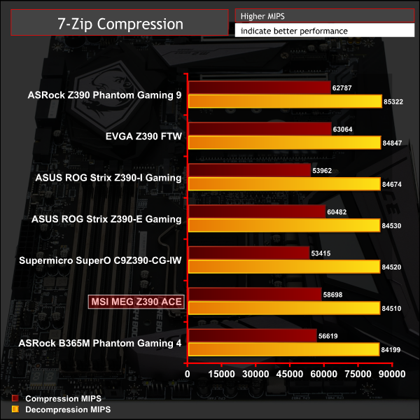 7-Zip is an open source Windows utility for manipulating archives. We measure the Total Rating performance using the built-in benchmark tool. The test stresses all CPU cores to 100% and shows an affinity for memory bandwidth.