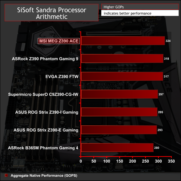SiSoft Sandra 2018 is a multi-function utility program that supports remote analysis, benchmarking and diagnostic features for PCs, servers, mobile devices and networks. We run the application’s processor arithmetic test to gauge the CPU performance on each tested motherboard.