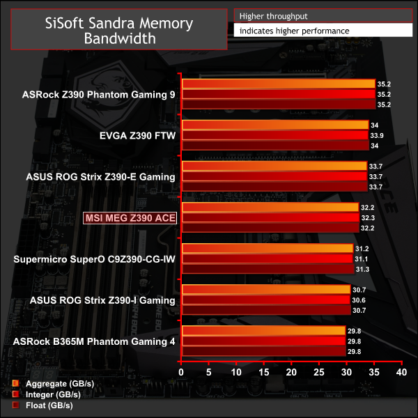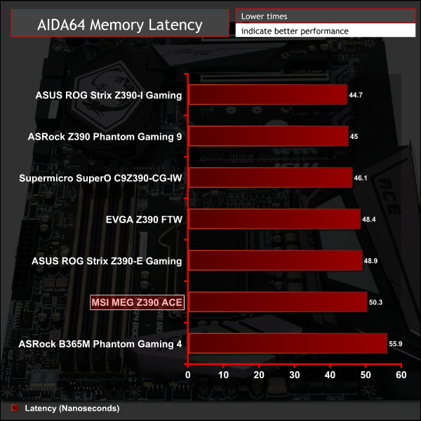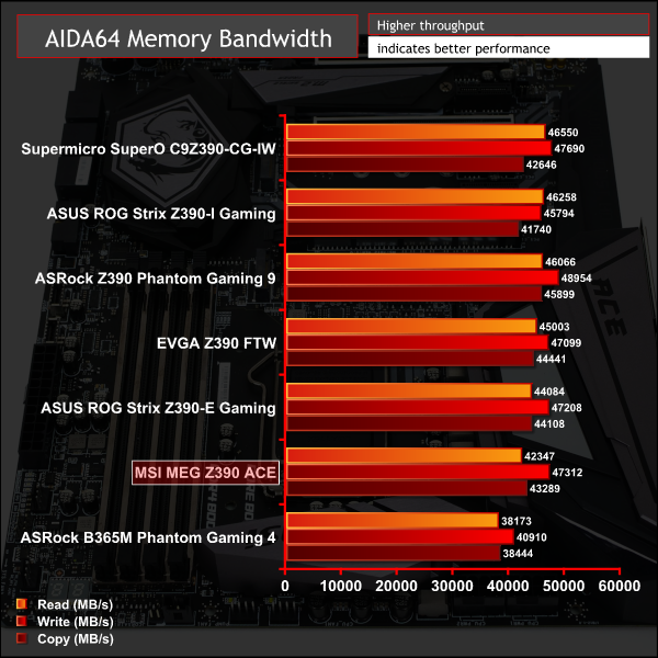 Memory performance was slightly towards the lower-end of the field for the MSI MEG Z390 ACE, but fundamentally there's not much separating all Z390 motherboards on test.