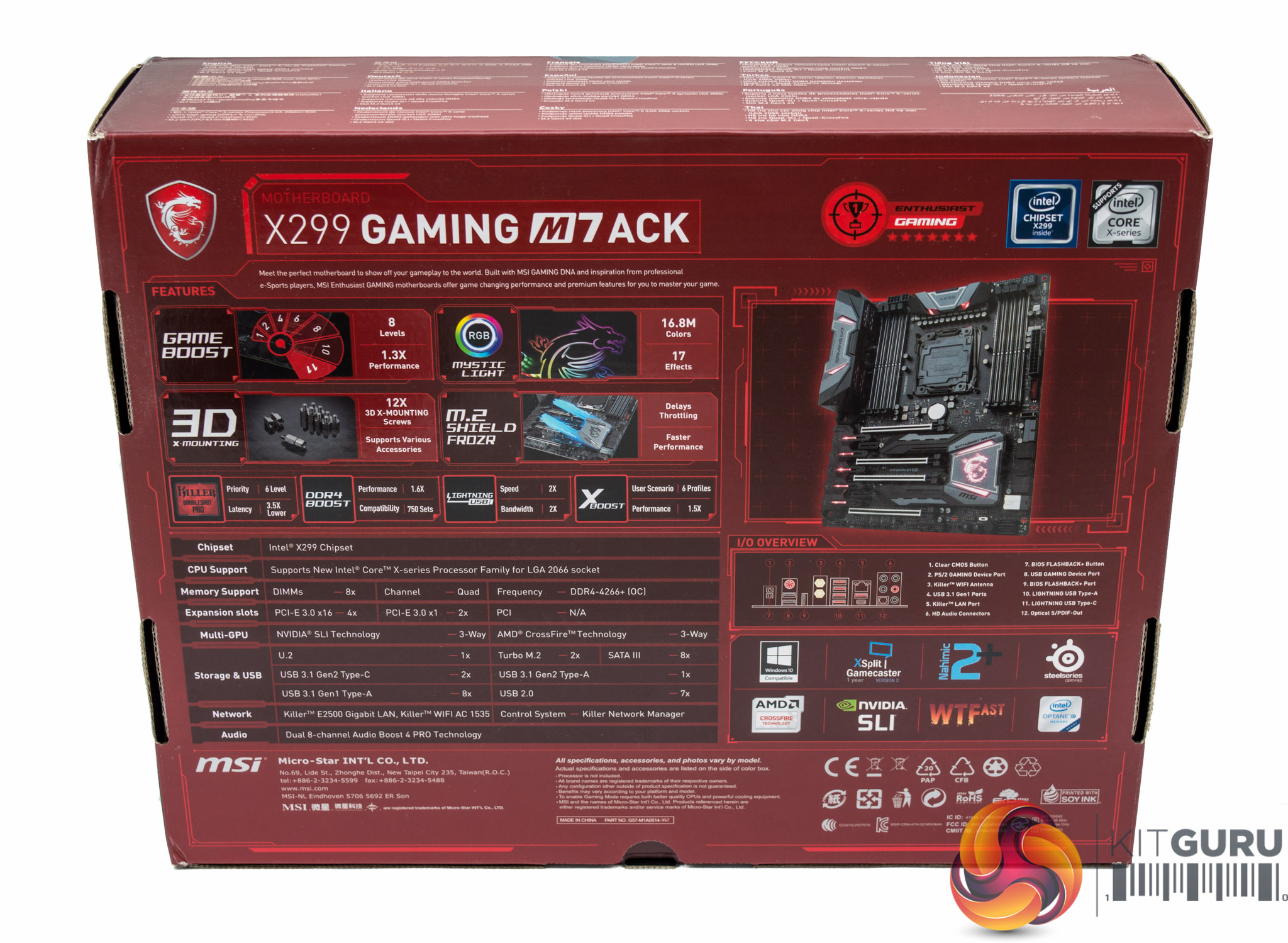 MSI's packaging is fairly typical of its Gaming line of products with a strong red and black theme. The rear of the packaging highlights four standout features which are the GameBoost switch, RGB Mystic Light, 3D X-Mounting and M.2 Shield Frozr all of which will be detailed as the review progresses.